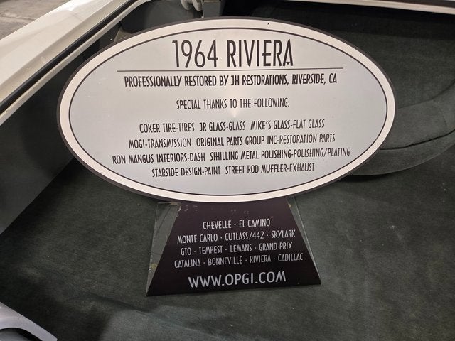 1964 Buick Riviera Sport Coupe. Arctic White/ Black Vinyl Interior. 425 Cubic Inch Nailhead V8, 3 Speed Automatic, P/ Steering, P/ Brakes, P/ Drivers Seat, Bucket Seats w/ Center Console, Seat Belts, Sonomatic AM Radio, Remote Drivers Side Mirror, Dual Exhaust, 15 Wheels w/ Wire Covers, Coker Whitewall Tires. Purchased By Original Parts Group In Seal Beach, CA To Develop Their Line Of Buick Riviera Restoration Parts. Restored by JH Restorations, In Riverside, CA. Displayed At The SEMA Show In 2010. Only 63,000 Miles.