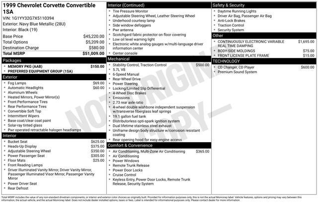 1999 Corvette Convertible. Navy Blue Metallic w Red Hash Marks/ Black Leather Sport Seats/ Black Top. 345 HP LS1, 6 Speed Manual, F45 Selective Real Time Dampening Suspension, Active Handling, Heads Up Display, P/ Telescope Steering Column, Twilight, P/ Seats, Sony Touchscreen Audio w/ Bluetooth® & XM Satellite Radio, Dual Zone Air, Memory, Fog Lamps, Embroidered Floor Mats, G3 Smoked Lense LED Side Marker Lamps, C5-R Lemans Style Headlamps, Magnaflow Performance Exhaust, Drilled/ Slotted Brake Rotors, Red Brake Calipers, Chrome ZR1 Style Wheels. Local Trade. Only 91,400 Miles.