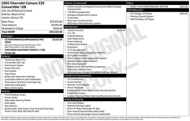 2002 Camaro SS Convertible. Black/ Ebony Leather/ Black Top. 35th Anniversary Of Camaro Production. Ram Air 345 HP LS1, 6 Speed Manual w/ Hurst Shifter, Traction Control, Air Conditioning, Tilt Wheel, Cruise Control, AM/FM/CD Monsoon Audio System w/ Steering Wheel Controls, CD Changer, P/ Windows, P/ Locks, P/ Sport Mirrors, P/ Seat, Keyless Entry, SS Embroidered Floor Mats, P/ Top, P/ Trunk Release, Fog Lamps, SLP Dual Exhaust, Auburn Positraction Rear Axle, 10 Spoke Chrome Wheels. Only 1,600 Miles.