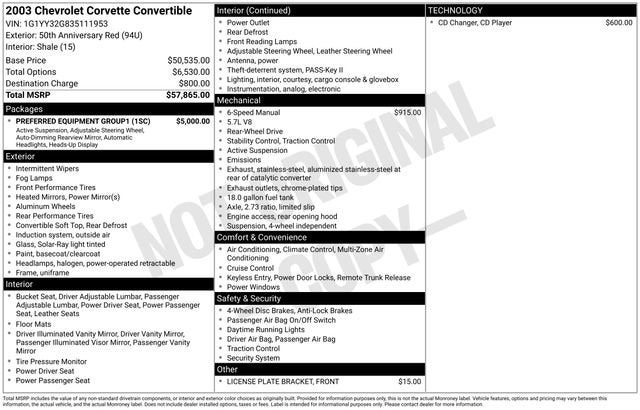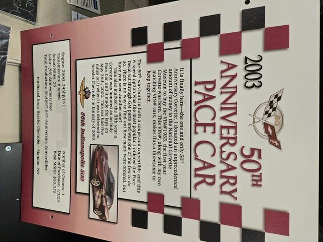 2003 Corvette 50th Anniversary Convertible. Special Order Serial Number 1953. Anniversary Red Metallic/ Shale Leather Sport Seats/ Shale Top. 350 HP LS1, 6 Speed Manual, Magnetic Selective Ride Control Suspension, 1SC Preferred Equipment Group, Active Handling, Heads Up Display, P/ Telescope Steering Column, Twilight, P/ Seats, Bose CD w/ CD Changer, Dual Zone Air, Memory, Fog Lamps, Floor Mats, Anniversary Gold Wheels. Only 63 Original Miles. Never Dealer Prepped. From The Dave Ressler Chevrolet Collection.