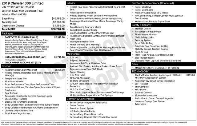 Clean Auto Check! Recent Arrival! **LOCAL TRADE**, 300 Limited, 4D Sedan, 3.6L 6-Cylinder SMPI DOHC, 8-Speed Automatic, AWD, Silver Mist Clearcoat, Black Leather, 19 harman/kardon GreenEdge Speakers, 19 x 7.5 Polished Aluminum Wheels, Adaptive Cruise Control w/Stop, Advanced Brake Assist, Apple CarPlay/Android Auto, Auto High Beam Headlamp Control, Blind Spot & Cross Path Detection, Delete Power Backlight Sunshade, Dual front side impact airbags, Dual-Pane Panoramic Sunroof, Exterior Mirrors Courtesy Lamps, Exterior Mirrors w/Supplemental Signals, Front dual zone A/C, Full Speed FWD Collision Warn Plus, Genuine wood console insert, Genuine wood dashboard insert, Genuine wood door panel insert, Google Android Auto, harman/kardon Audio Group, harman/kardon GreenEdge Amp, Heated front seats, Heated rear seats, Heated steering wheel, Lane Departure Warning Plus, Overhead airbag, ParkSense Front/Rear Park Assist System, Power driver seat, Power Multi Function Mirror Manual Fold, Rain Sensitive Windshield Wipers, SafetyTec Plus Group, Steering wheel mounted audio controls, Surround Sound, Ventilated front seats. 18/27 City/Highway MPG