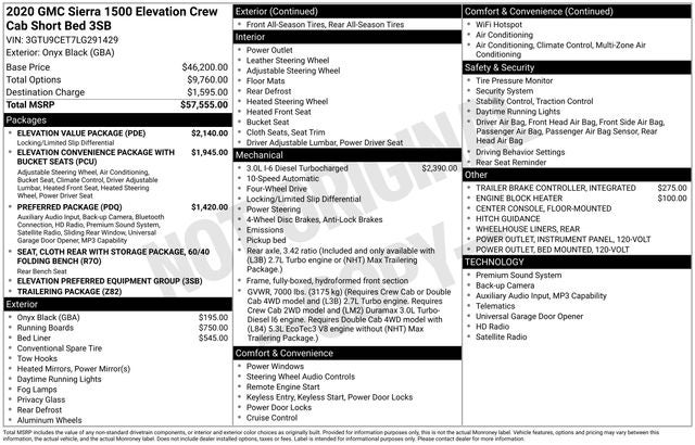 Local trade! **Recent Arrival**, Sierra 1500 Elevation, 4D Crew Cab, 3.0L I6, 10-Speed Automatic, 4WD, Onyx Black, Black Cloth, 10-Way Power Driver Seat Adjuster w/Lumbar, 12-Volt Rear Auxiliary Power Outlet, 2 USB Ports, 4G LTE Wi-Fi Hotspot Capable, 6-Speaker Audio System Feature, AM/FM radio, Body-Color Surround Grille, Cloth Rear Seat w/Storage Package, Color-Keyed Carpeting Floor Covering, Compass, Deep-Tinted Glass, Dual front side impact airbags, Dual-Zone Automatic Climate Control, Electric Rear-Window Defogger, Electrical Lock Control Steering Column, Elevation Convenience Package, Elevation Convenience Package w/Bucket Seats, Elevation Value Package, Exterior Parking Camera Rear, Floor-Mounted Center Console, Front Bucket Seats, Front Frame-Mounted Black Recovery Hooks, Front Rubberized-Vinyl Floor Mats, GMC Connected Access Capable, Heated Driver & Front Outboard Passenger Seating, Heated Steering Wheel, Heavy-Duty Rear Locking Differential, Hitch Guidance, Keyless Open & Start, LED Cargo Area Lighting, Low tire pressure warning, Manual Tilt Wheel Steering Column, Manual Tilt-Wheel & Telescoping Steering Column, OnStar & GMC Connected Services Capable, Overhead airbag, Power Door Locks, Power Front Windows w/Driver Express Up/Down, Power Front Windows w/Passenger Express Down, Power Rear Windows w/Express Down, Preferred Equipment Group 3SB, Premium Bose 7-Speaker Sound System, Radio: Premium GMC Infotainment Sys w/Multi-Touch, Rear Dual USB Charging-Only Ports, Rear Rubberized-Vinyl Floor Mats, Rear Wheelhouse Liners, Remote keyless entry, Remote Vehicle Starter System, Single-Zone Manual/Semi-Automatic Air Conditioning, Spray-On Pickup Bed Liner w/GMC Logo, Steering Wheel Audio Controls, Steering wheel mounted audio controls, Theft Deterrent System (Unauthorized Entry), Trailering Package. 22/26 City/Highway MPG