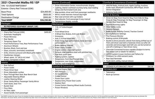 One Owner! Clean Auto Check! Recent Arrival! **LOCAL TRADE**, **Recent Arrival**, Malibu RS, 4D Sedan, 1.5L DOHC, CVT, FWD, Cherry Red Tintcoat, Jet Black Cloth, AM/FM radio, Illuminated entry, Preferred Equipment Group 1SP. 29/36 City/Highway MPG