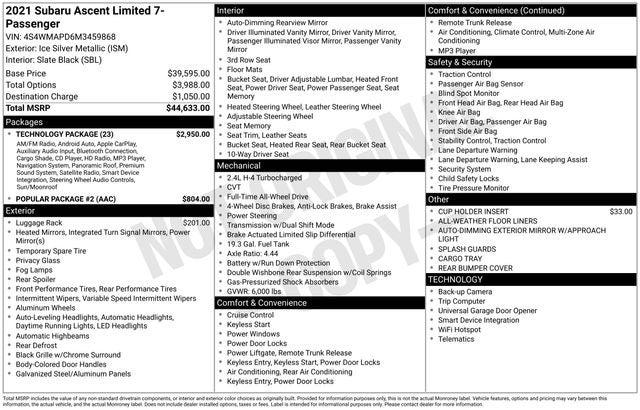 Local trade! **LOCAL TRADE**, **Recent Arrival**, Ascent Limited, 4D Sport Utility, 2.4L 4-Cylinder DOHC 16V, Lineartronic CVT, AWD, AM/FM radio: SiriusXM, Automatic temperature control, Dual front side impact airbags, Electronic Stability Control, Exterior Parking Camera Rear, Front dual zone A/C, Fully automatic headlights, Heated Front Bucket Seats, Heated rear seats, Heated steering wheel, Memory seat, Overhead airbag, Overhead console, Perforated Leather-Trimmed Upholstery, Power Liftgate, Radio: Subaru STARLINK 8.0 Multimedia Plus System, Remote keyless entry, STARLINK/Apple CarPlay/Android Auto, Steering wheel mounted audio controls, Tachometer, Wheels: 20 x 7.5 J Dk Gray Alloy w/Machine Finish. Odometer is 17323 miles below market average! 20/26 City/Highway MPG