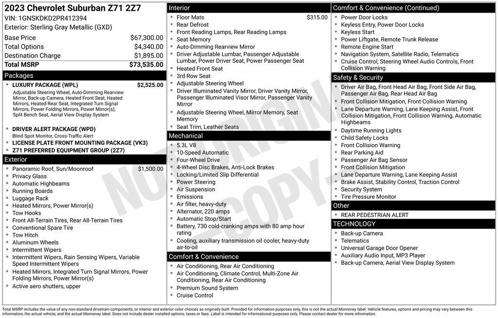 Local Trade. Local Trade!, Clean Autocheck!, 10-Way Power Driver & Passenger Seat Adjusters, 1st & 2nd Row Color-Keyed Carpeted Floor Mats, 1st, 2nd & 3rd Row All-Weather Floor Liners (LPO), 2-Speed Active Electronic AutoTrac Transfer Case, 2nd Row Pwr Release 60/40 Split-Folding Bench Seat, 3rd Row 60/40 Power-Folding Split-Bench, 3rd row seats: split-bench, 4-Wheel Disc Brakes, Apple CarPlay/Android Auto, Auto High-beam Headlights, Auto-Dimming Inside Rear-View Mirror, Black Tubular Assist Steps, Bose 9-Speaker Stereo Audio System Feature, Bright Front & Rear Door Sill Plates, Bumpers: body-color, Color-Keyed Carpeting Floor Covering, Delay-off headlights, Driver & Front Outboard Passenger Airbags, Driver Alert Package, Dual front impact airbags, Dual front side impact airbags, Dual-Pane Power Panoramic Sunroof, Emergency communication system: OnStar and Chevrolet connected services capable, Enhanced Driver Information Center, Floor Console w/Storage Area, Four wheel independent suspension, Front anti-roll bar, Front dual zone A/C, Front High-Approach Angle Fascia, Fully automatic headlights, Hands-Free Rear Power Programmable Liftgate, HD Surround Vision, Heated 2nd Row Outboard Seats, Heated Driver & Front Passenger Seats, Heated front seats, Heated Steering Wheel, Heavy-Duty Air Filter, Hill Descent Control, Infotainment Display, Lane Change Alert w/Side Blind Zone Alert, LED Daytime Running Lamps, License Plate Front Mounting Package, Low tire pressure warning, Luxury Package, Memory Settings, Memory Settings For Driver, Navigation System, Occupant sensing airbag, Outside Heated Power-Adjustable Mirrors, Overhead airbag, Power door mirrors, Power Liftgate, Power Tilt & Telescopic Steering Column, Preferred Equipment Group 2Z7, Rear anti-roll bar, Rear Cross Traffic Alert, Rear Pedestrian Alert, Red Recovery Hooks, Remote Start, SiriusXM Radio w/360L, Telescoping steering wheel, Tilt steering wheel, Universal Home Remote, Wireless Charging, Wrapped Steering Wheel.