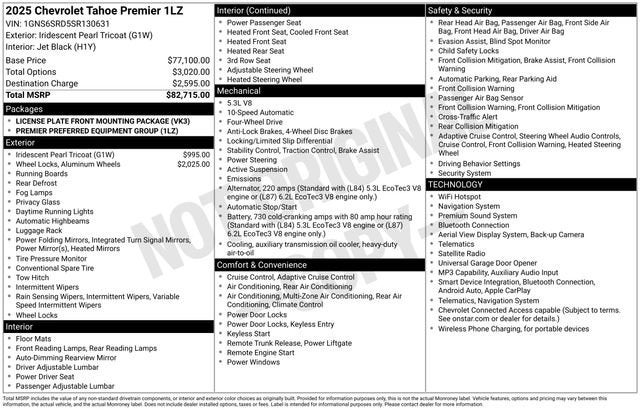 This is a Jerry’s Certified vehicle which offers true peace of mind. Each one includes a 45-day / 3,000-mile limited warranty, a comprehensive 115-point inspection, a free AutoCheck history report, and professional detailing and reconditioning. These vehicles are inspected, protected, and guaranteed, making them a standout choice for buyers seeking reliability and value. Certified. Tahoe Premier, 4D Sport Utility, EcoTec3 5.3L V8, 10-Speed Automatic with Overdrive, 4WD, Iridescent Pearl Tricoat, Black Leather, 22 6-Spoke Low Gloss Black Wheels, 3-Spoke Wrapped Steering Wheel, 3rd Row 60/40 Power-Folding Split-Bench Seat, 8-Way Power Driver Seat Adjuster, 8-Way Power Front Passenger Seat Adjuster, Apple CarPlay/Android Auto, Auto-Dimming Inside Rear-View Mirror, Bose 10-Speaker Centerpoint Surround Audio System Feature, Bright Front and Rear Door Sill Plates, Chrome Door Handles with Body-Color Strip, Chrome Mirror Caps, Color-Keyed Carpeting Floor Covering, Dual Exhaust System, Front Bucket Seats, Front dual zone A/C, Front LED Fog Lamps, Front Pedestrian and Bicyclist Braking, Frontal Driver and Outboard Passenger Airbags, Heated 2nd Row Outboard Seats, Heated Steering Wheel, LED Headlamps with LED Daytime Running Lamps, LED Tail Lamps, Magnetic Ride Control Suspension, Memory Settings, Outside Heated Power-Adjustable Mirrors, Power Release 2nd Row Bucket Seats, Power Tilt and Telescopic Steering Column, Preferred Equipment Group 1LZ, Rear Power Liftgate, Remote Start, SiriusXM with 360L Trial Subscription, Universal Home Remote, Wireless Phone Charging. Certification Program Details: Type your description here**This price includes a $1,000 finance incentive. Vehicle MUST be financed by Jerry’s Chevrolet of Beresford or incentive will be forfeited** Visit us today at Jerry’s in Beresford to check out our great selection of vehicles or call one of our sales professionals at 605-763-6000 to schedule a test drive.